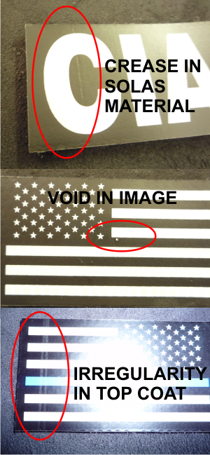 Possible blemishes are: Voids in the matt finish top coat. This will look like a shiny dot on the patch. Irregular matt finish top coat. This will look like a dull streak on the patch. (pictured left) Blemish in the printed image. This may look like a blurb in the black or color, basically printing in an area where it is not supposed to be. This may also be a void in the image with a reflective solas dot showing, this will likely be touched up with a magic marker to maintain patch covert ness. Light gray streak on printed tan or white. Will show up as a single streak on the tan or white printing. Solas imprint. This defect will show up mostly on non-covert patches, it will look like light gray printing on the raw solas Crease in Solas material. This defect will look like a groove or fold in the Solas material. (pictured left) Shifted color. This defect the image is shifted slightly from where it is supposed to be, resulting in a tiny bit os Solas showing. Please not these patches may not be 100% covert. Patches with this defect will be marked. |